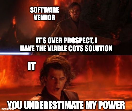 Candidly, as a researcher who has observed the finance and procurement tech markets for a bit now, I was initially surprised to see how many companies consider building solutions when COTS alternatives abound. But the more I got into these discussions with not only finance and procurement leaders but also their IT colleagues, I started to understand at least where the temptation begins. It’s kind of like in Star Wars where they say that one negative emotion leads to the next, and eventually you lose it and become a Very Evil Bad Guy. Which in the corporate world looks approximately like this: