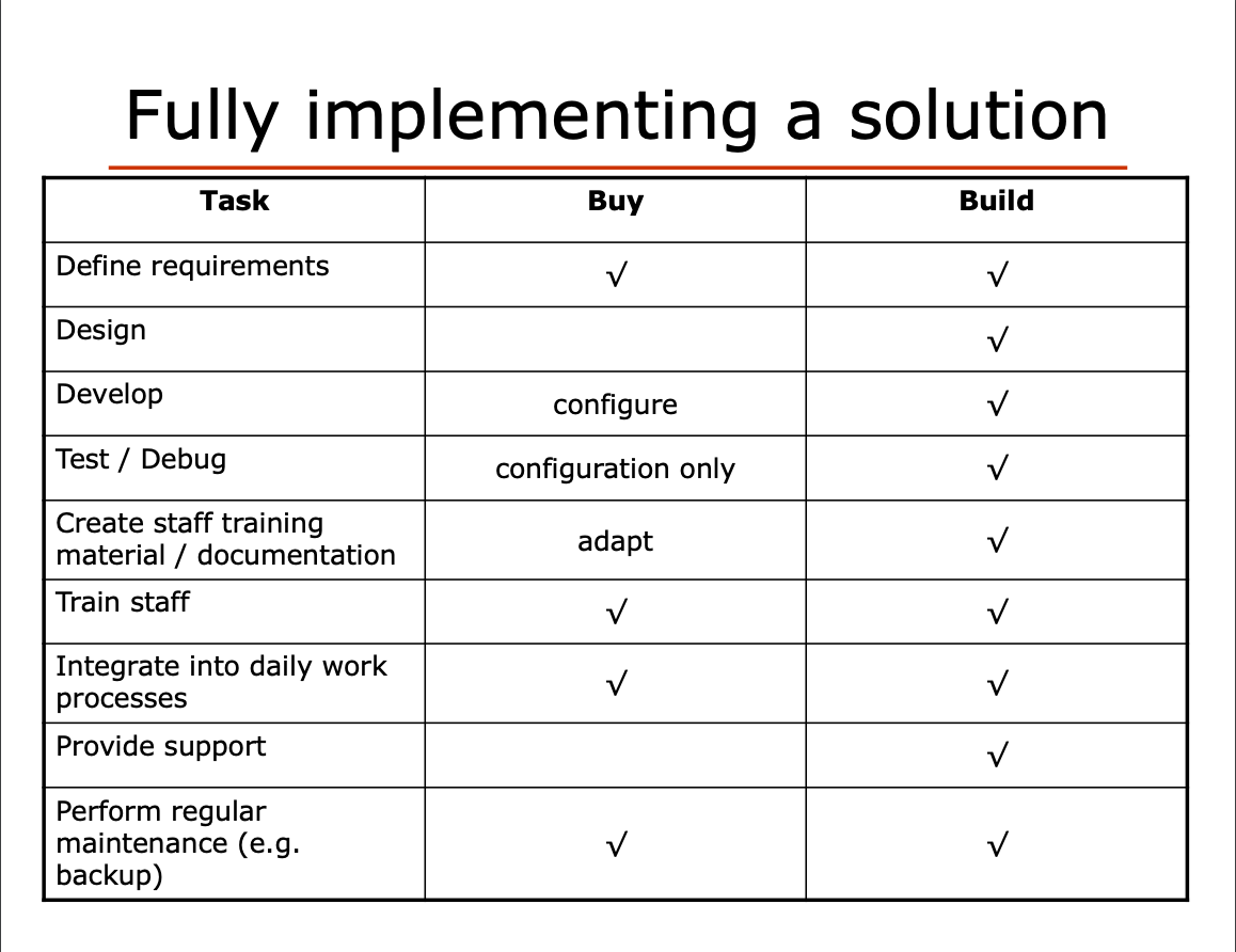 When you do a simple breakdown of the resource burden between build vs. buy, though, the advantages for buy are pretty obvious: