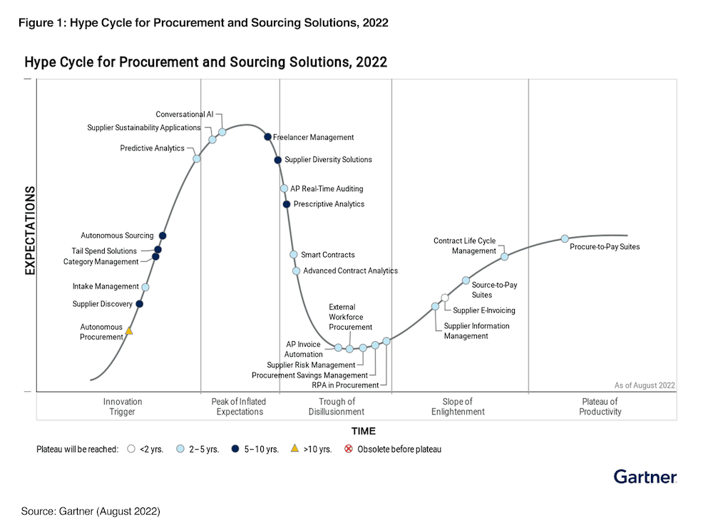 One way I’ve enjoyed explaining this perspective recently is pointing out a seemingly odd set of choices in the Gartner Hype Cycle for Sourcing and Procurement Solutions. In the August 2022 version of the report, Gartner analysts put P2P, S2P, and CLM systems in the category of (or approaching) the “plateau of productivity.” This makes sense, given the above discussion and the fact that many of the most commonly used vendors were first incorporated in the 1990s or early 2000s.