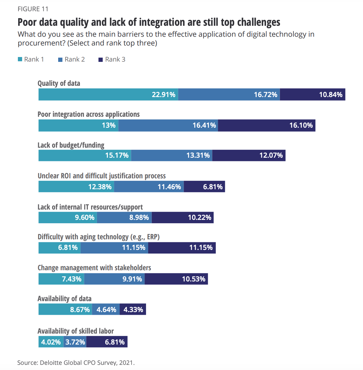 Take a look at the 2021 Deloitte CPO survey to see what I mean. When asked what the main barriers to the effective application of digital technology in procurement are, CPOs align on a few recurring themes: