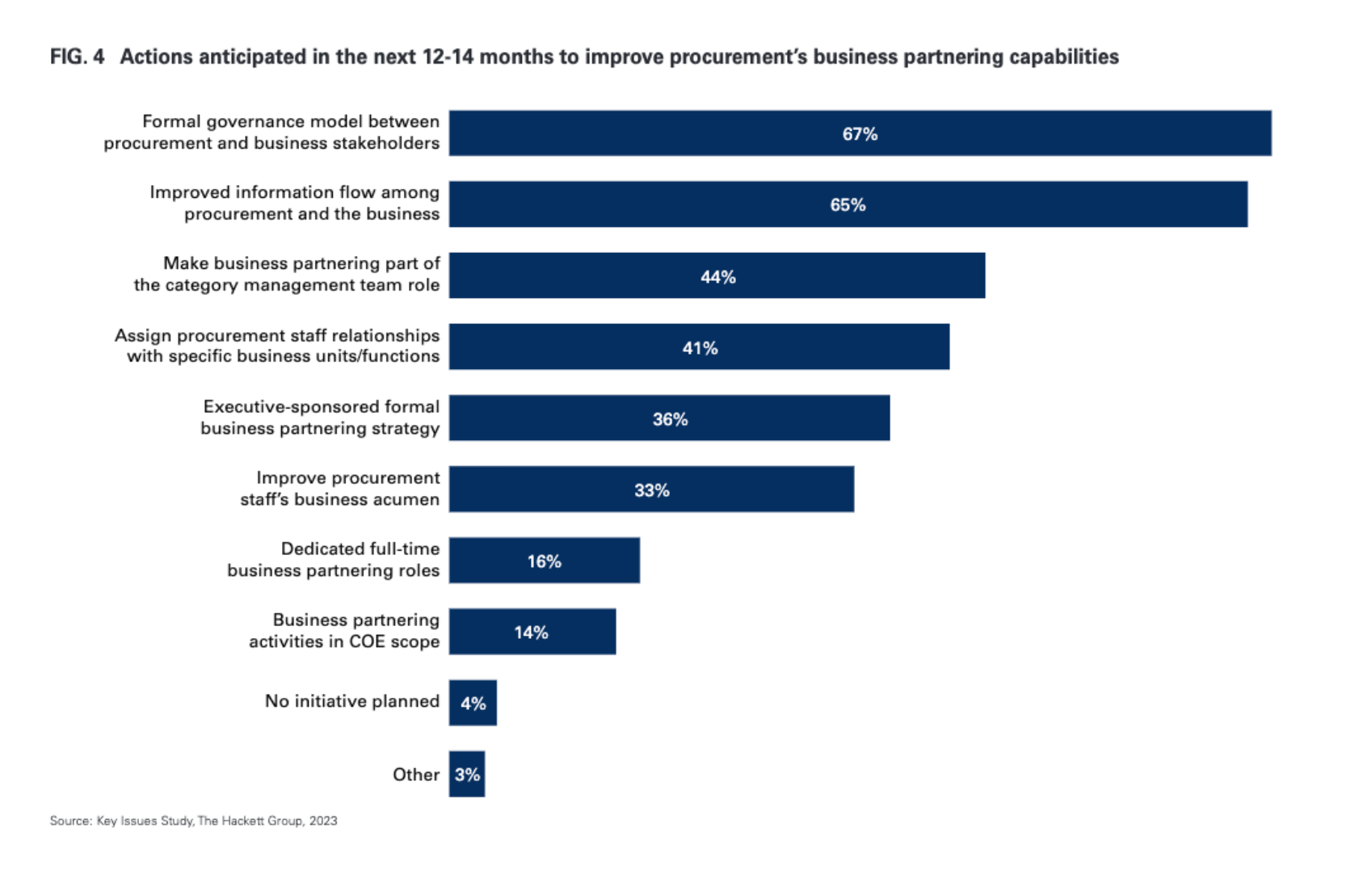 Which is why this term, seemingly dry on the surface, is gaining traction as a top-of-mind priority for finance and procurement chiefs. One leading indicator that popped up recently is The Hackett Group’s 2023 Key Issues study. If you dig into the meat of the report, you’ll find that governance is one rising areas of focus for teams to improve their perception as a true business partner. Look at this result for the key priority of acting as a strategic advisor to the business: