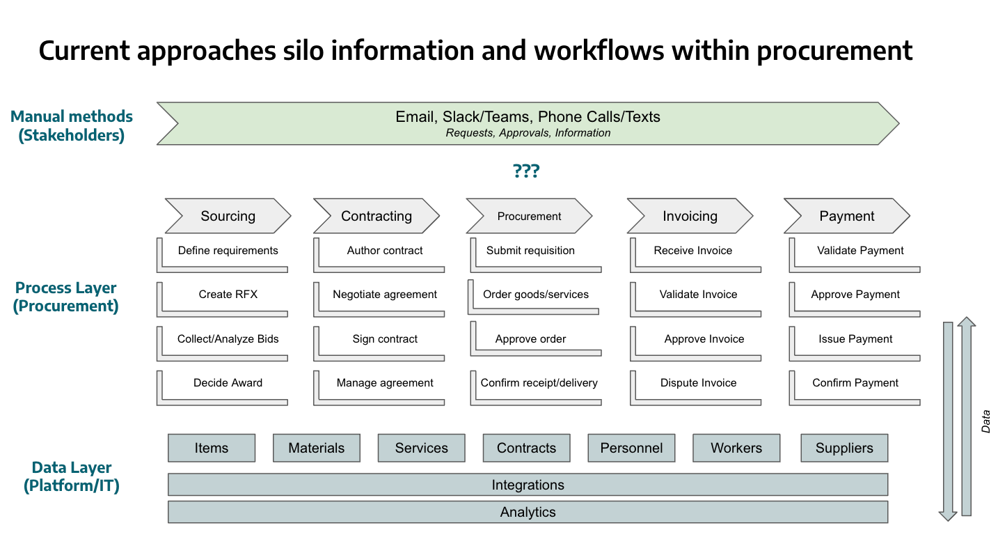 If you were to visualize this problem, it’s this: the source-to-pay process flows in a siloed layer, and stakeholders outside of it default to manual methods (email, text, phone, etc.) to figure out how to interact with the layer below.