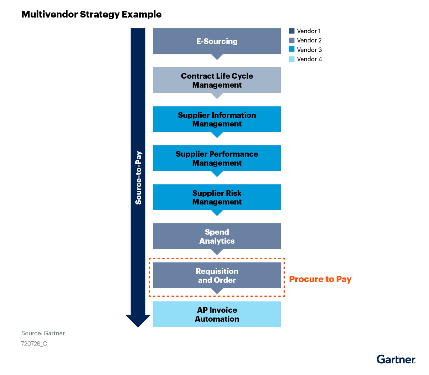 This Gartner chart is from a report on assessing the risk and value of procurement applications (you can check it out for free at the link). To summarize, the idea that you can standardize the whole source-to-pay process on a single solution these days is now not recommended. Rather, the tools you pick for various parts of the process will need to align with the stakeholders who are key co-owners or users in that process. And the capabilities that users in, for example, accounting and treasury or legal need to make their part of the purchasing process work may not be deeply covered by an S2P player. As Gartner put it:
